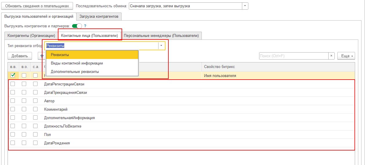 Сопоставить реквизиты Контактных лиц 1С со свойствами пользователей.