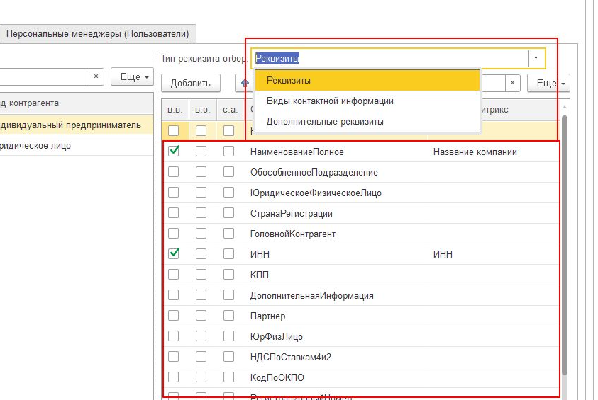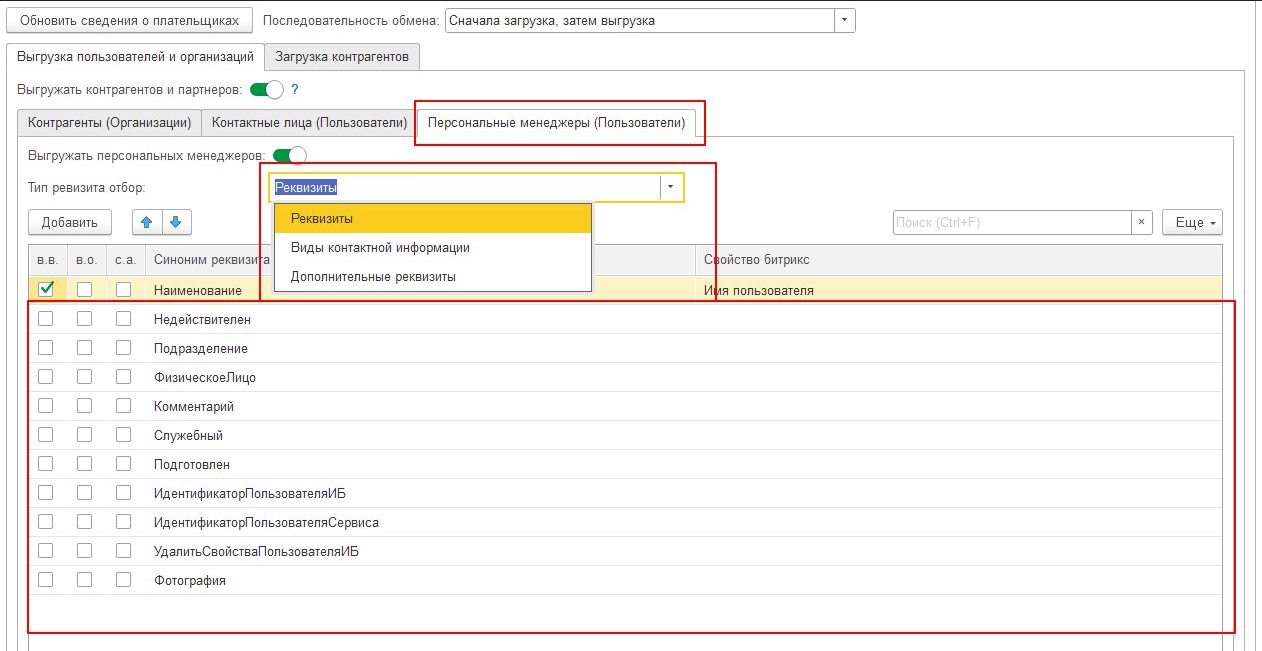 При необходимости выгрузки Персональных менеджеров включить опцию Выгружать контрагентов и партнеров и сопоставить реквизиты Персональных менеджеров 1С со свойствами пользователей.