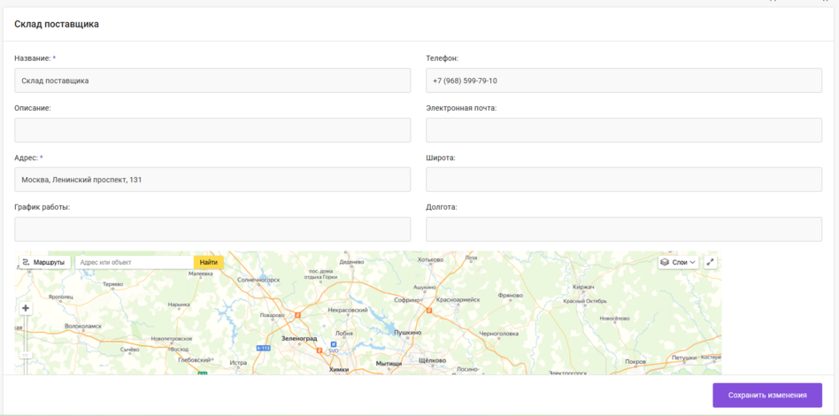 При клике на карточку склада открывается страница с детальным описанием, где можно отредактировать данные.