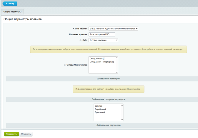 Администратор может гибко настраивать работу логистики, создавая правила с нужными параметрами под разные режимы. Для каждого режима можно создать одно или несколько правил с разными условиями, например, разрешить DBS только для крупногабаритных товаров, сделать одно правило FBS для определённой категории с одной комиссией и другое — для другой категории с иной комиссией. Поставщик работает в рамках доступных ему правил, а если для одной категории товаров у него есть несколько вариантов, он может выбрать наиболее удобный.
