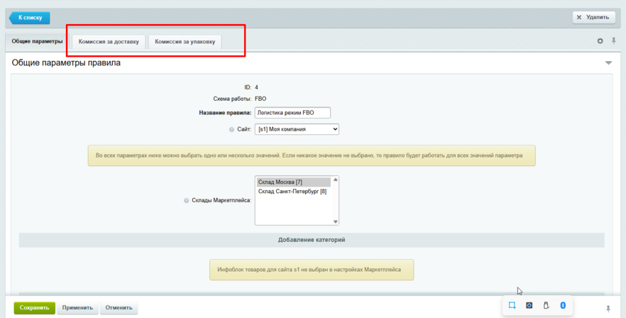 4. Если выбран режим логистики FBO или FBS, при необходимости заполнить параметры взимания комиссий;