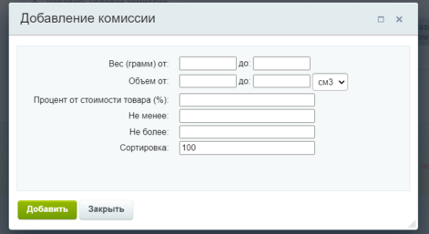 Чтобы взимать комиссии за доставку товаров, на вкладке Комиссия за доставку нужно включить параметр Включить снятие комиссии и настроить правила ее расчета. Можно создать любое количество правил взимания комиссии в зависимости от веса и габаритов товаров.
