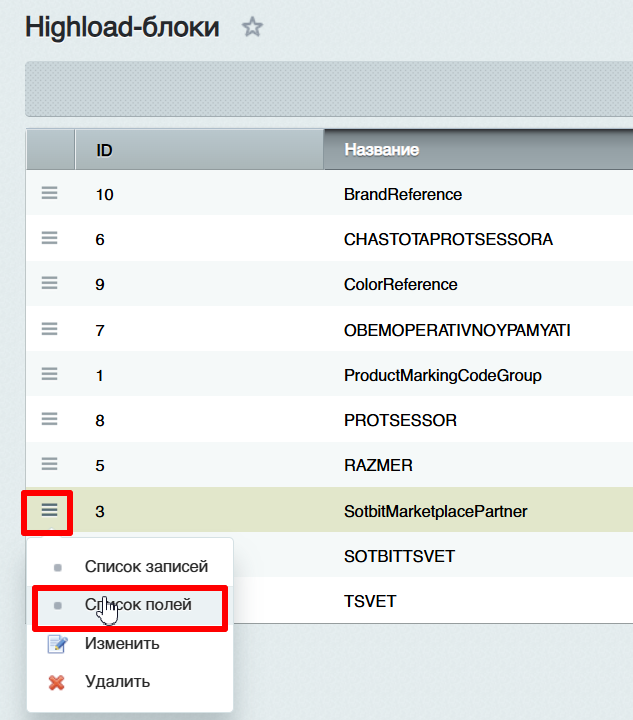 2. Выбрать в меню действий напротив Highload-блока SotbitMarketplacePartner пункт Список полей.